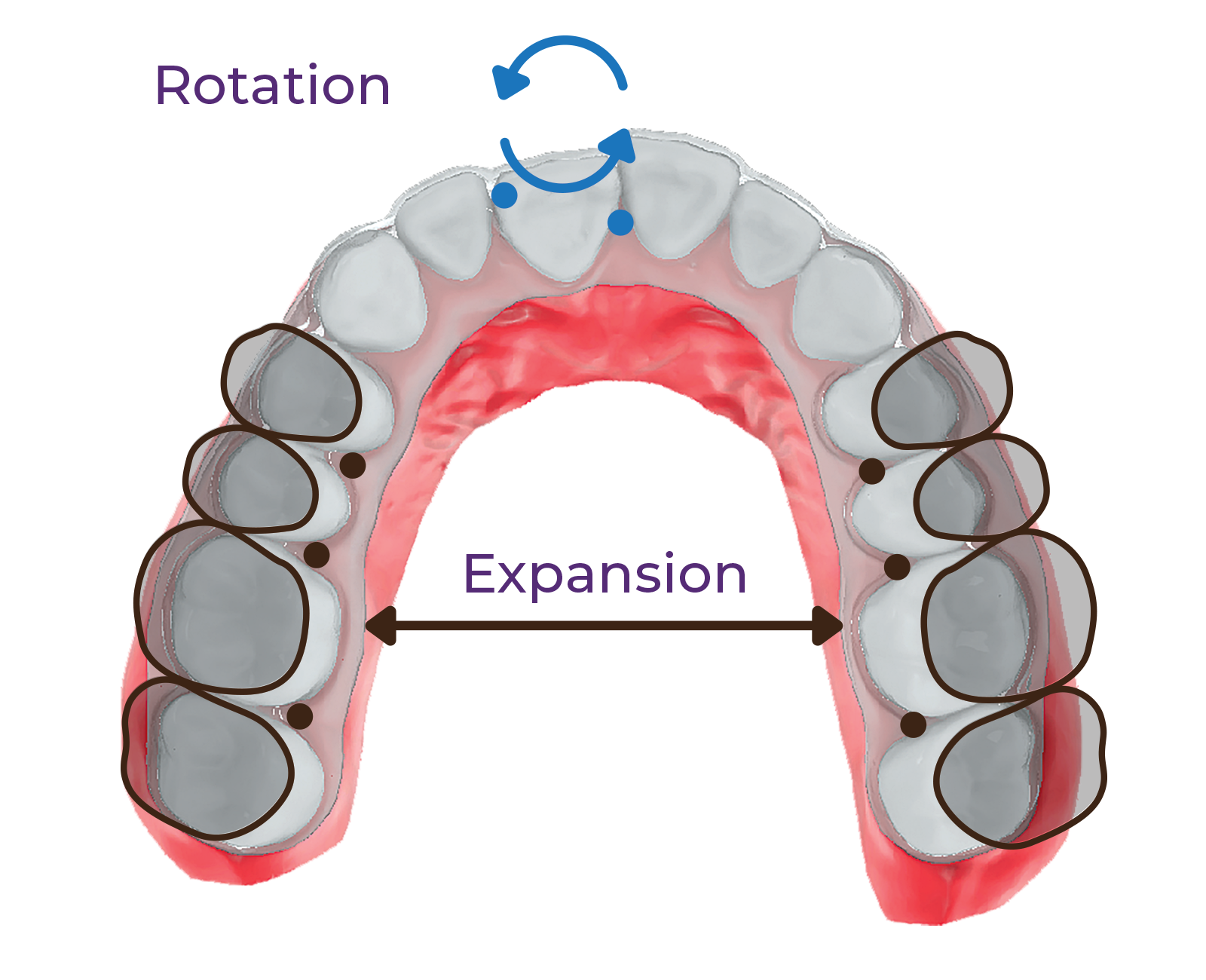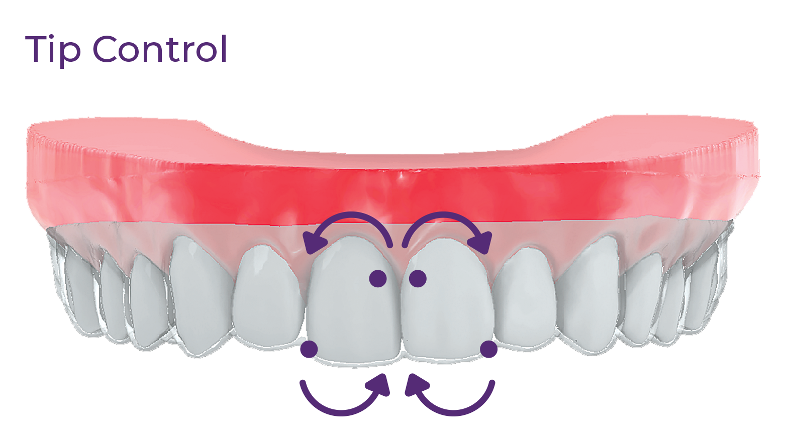 The TrioDim Force™ technology is implemented in all TrioClear cases by our experienced technicians. Depending on the specific movement required, our dental technicians will design the divot at precise locations according to the TrioDim Force principles. Every divot is measured and placed explicitly with special instruments to ensure precision. Below is a simple summary of different movements and the corresponding placement of the divots.
